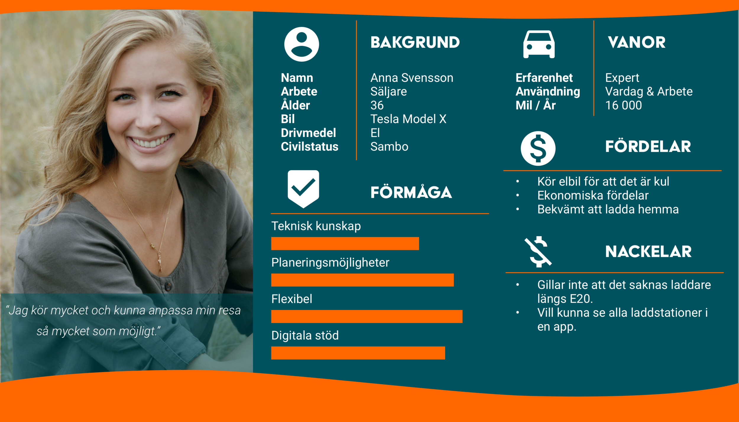 The user interviews focused on describing the experiences of owning and using an Electric Vehicle. The users expressed a lack of functionality across most existing apps that help Electric Vehicle users navigate and utilize different charging stations. Overall the landscape for existing users of Electric Vehicles was still relatively small compared to fossil fuel alternatives. Most of our users were high educated males with a background in engineering and an interest in problem-solving. After our interviews, we created personas and scenarios to express the users' needs.